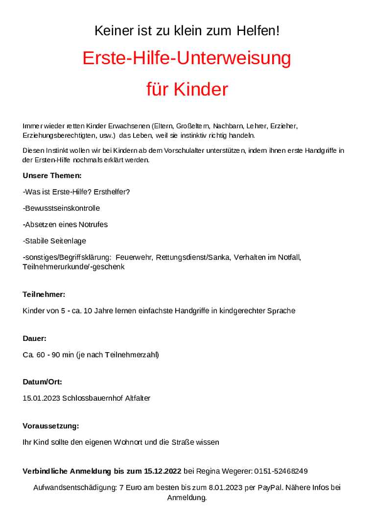 Immer wieder retten Kinder Erwachsenen (Eltern, Großeltern, Nachbarn, Lehrer, Erzieher, Erziehungsberechtigten, usw.) das Leben, weil sie instinktiv richtig handeln. Diesen Instinkt wollen wir bei Kindern ab dem Vorschulalter unterstützen, indem ihnen erste Handgriffe in der Ersten-Hilfe nochmals erklärt werden.