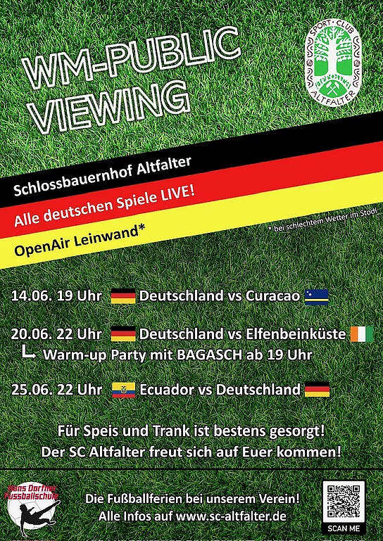 Warm-up Party mit der Band "Bagasch" ab 19 Uhr. Anschließend Deutschland vs Elfenbeinküste (Anstoß 22:00 Uhr).