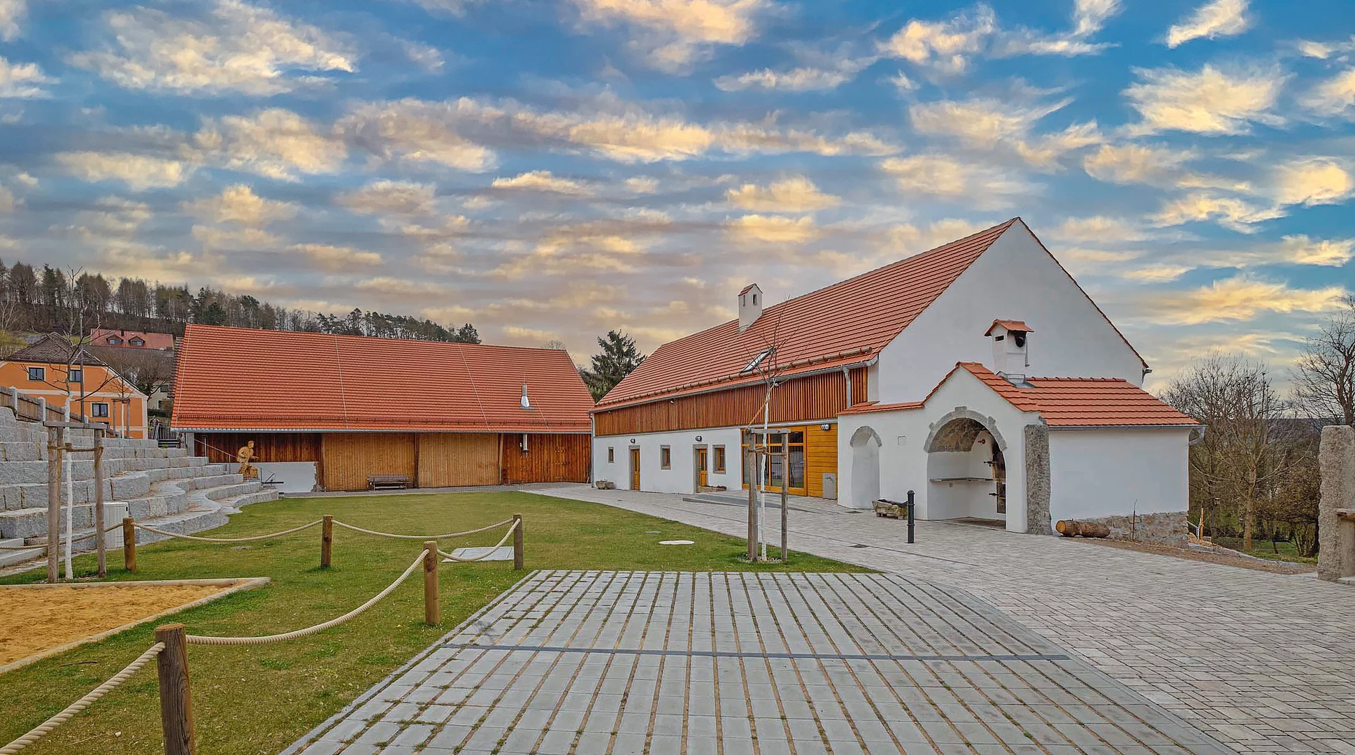 Schließlich ging es bei der Neugestaltung der Außenanlagen zu einer multifunktionalen Fläche, mit Spielflächen für Kinder und Festplatz für die traditionelle Kirchweih noch um eine optische Abrundung des gesamten Objektes. Ein Dorfbackofen rundet schließlich das Gesamtprojekt ab.