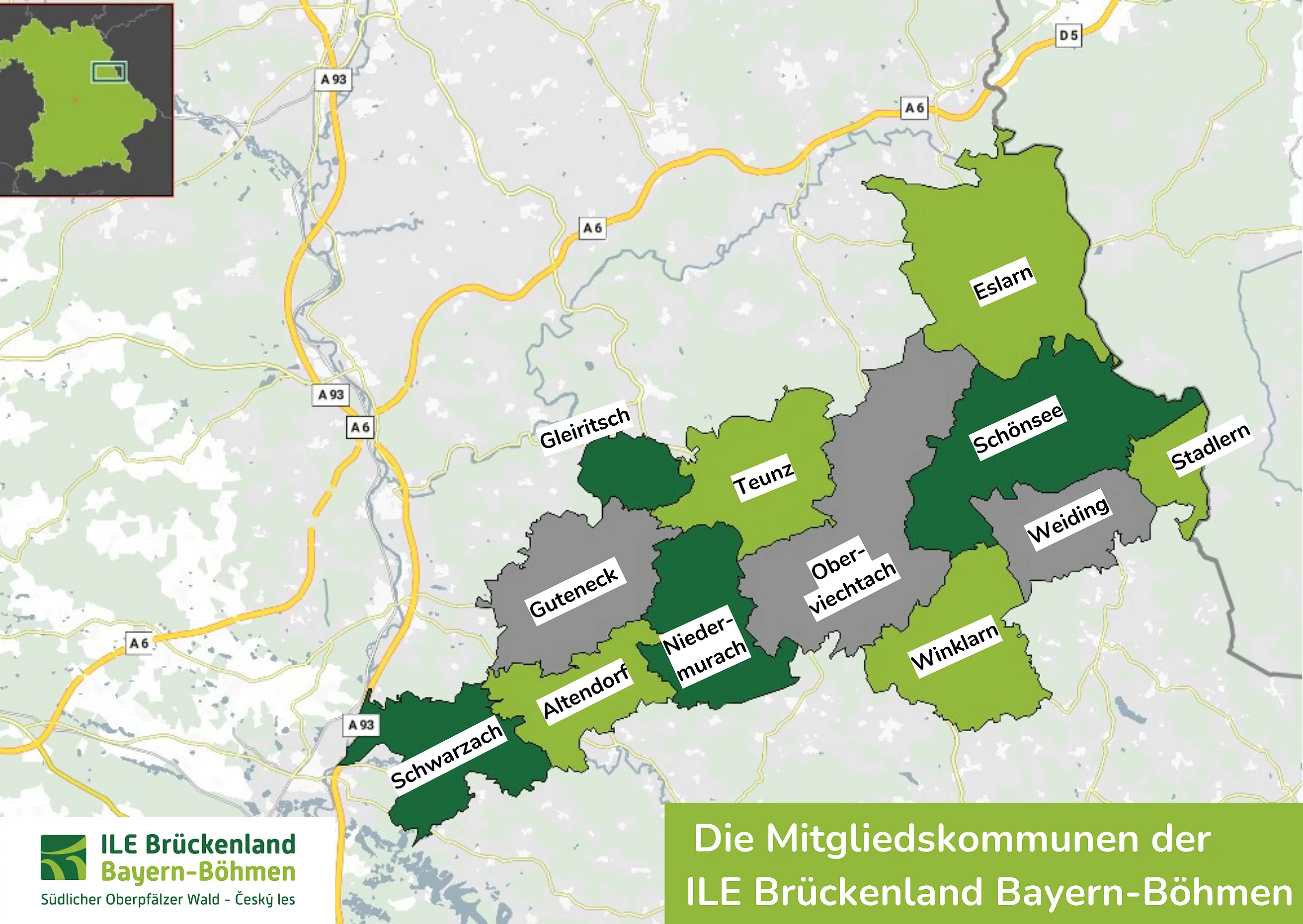 Auf eine Fläche von rund 400 km², welche sich über die Landkreise Schwandorf und Neustadt an der Waldnaab erstreckt, leben ca. 20.000 Menschen in den 12 Brückenlandkommunen in Mitten des Oberpfälzer Waldes. Zwischen dem Schwarzacher Ortsteil Wölsendorf im Naabtal und dem Grenzübergang Tillyschanze an der Bayerisch-Tschechischen Grenze liegen die beiden Städte Oberviechtach und Schönsee, sowie die beiden Märkte Eslarn und Winklarn, wie auch die Gemeinden Altendorf, Gleiritsch, Guteneck, Niedermurach, Stadlern, Teunz und Weiding. Sie alle und auch die Gemeinde Schwarzach bei Nabburg sind Mitglieder der ILE Brückenland Bayern-Böhmen.