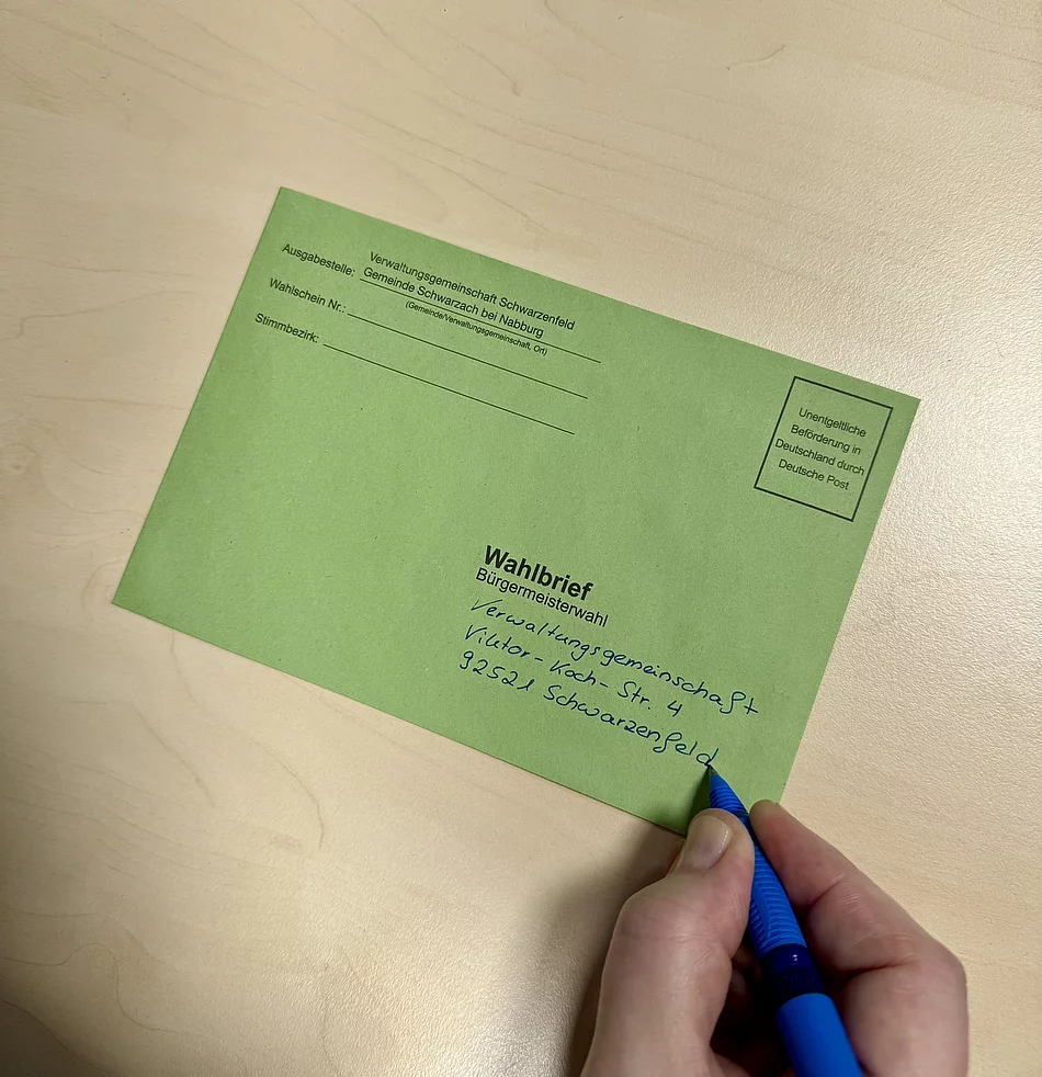 Auf Grund der kurzen Fristen hat es die beauftragte Druckerei bei den grünen Wahlbriefen zur Bürgermeisterwahl Schwarzach versäumt, die Adresse der VG Schwarzenfeld einzudrucken. Damit sichergestellt ist, dass uns die Briefe rechtzeitig erreichen, schreiben Wählerinnen und Wähler bitte die Adresse der Verwaltungsgemeinschaft Schwarzenfeld, Viktor-Koch-Str. 4, 92521 Schwarzenfeld händisch auf die Briefe. Noch besser ist es, den Brief in den Rathaus-Briefkasten zu werfen.