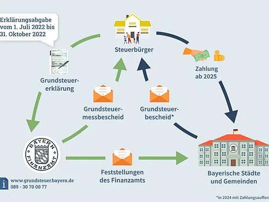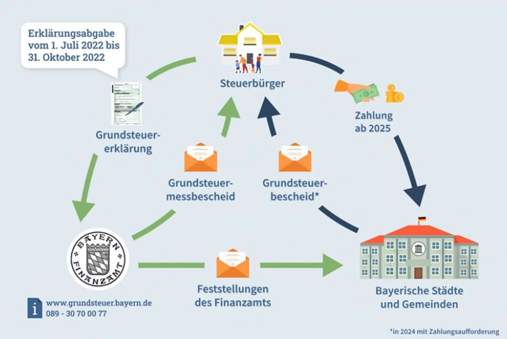 Waren Sie am 1. Januar 2022 (Mit-)Eigentümerin bzw. (Mit-)Eigentümer eines Grundstücks, eines Wohnobjekts oder eines Betriebs der Land- und Forstwirtschaft in Bayern? – Dann aufgepasst: Um die neue Berechnungsgrundlage für die Grundsteuer feststellen zu können, sind Grundstückseigentümerinnen und -eigentümer sowie Inhaberinnen und Inhaber von land- und forstwirtschaftlichen Betrieben verpflichtet, eine Grundsteuererklärung abzugeben. Hierzu wurden Sie durch Allgemeinverfügung des Bayerischen Landesamts für Steuern am 30. März 2022 öffentlich aufgefordert. Für die Erklärung sind die Eigentumsverhältnisse und die tatsächlichen baulichen Gegebenheiten am 1. Januar 2022 maßgeblich, sog. Stichtag.