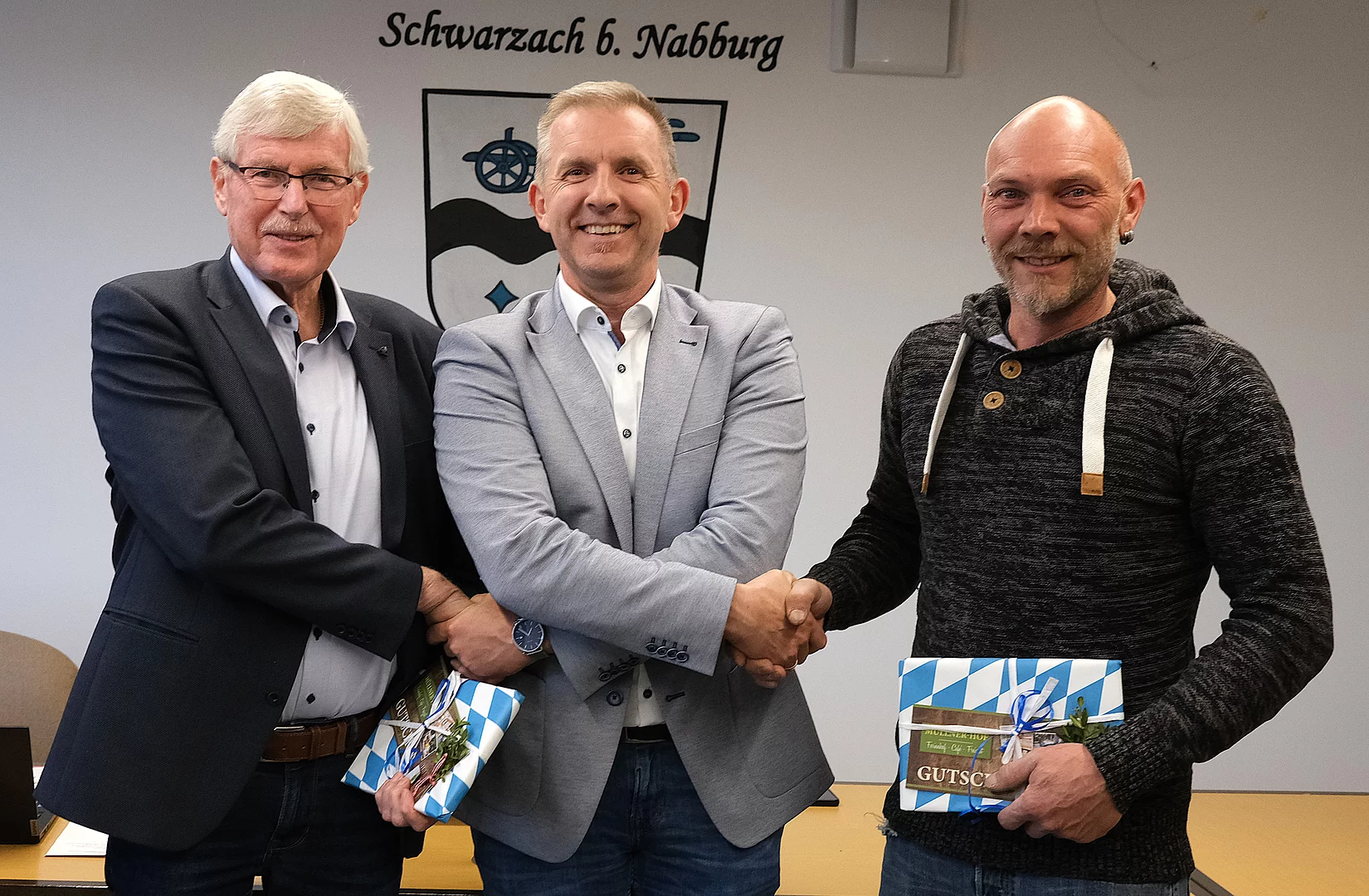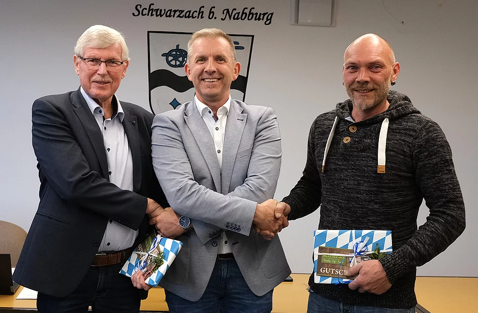 Bürgermeister Michael Wilfahrt verabschiedet Georg Mayer (l.) und Manuel Fleischmann (r.) und dem Gremium. Nicht auf dem Foto: Michael Singer.